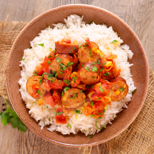 Een stoofgerecht waarin de specerijen zich langzaam vermengen met tomaat en worst tot een krachtig geheel.